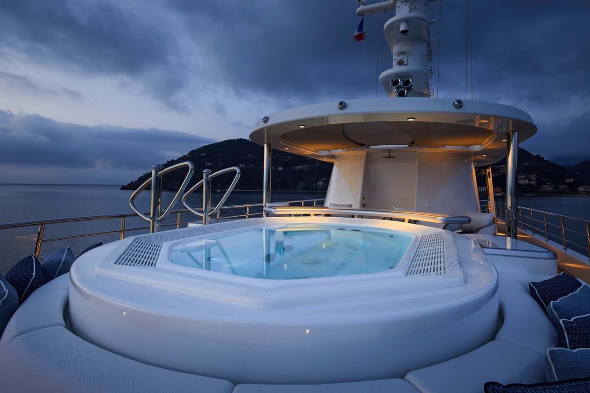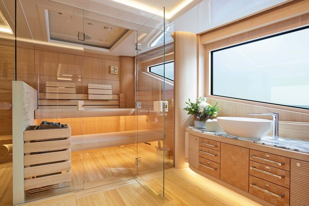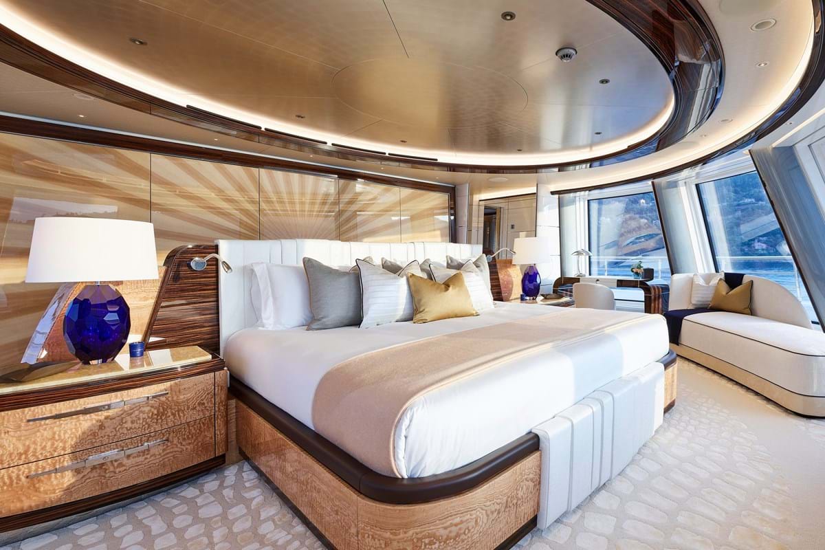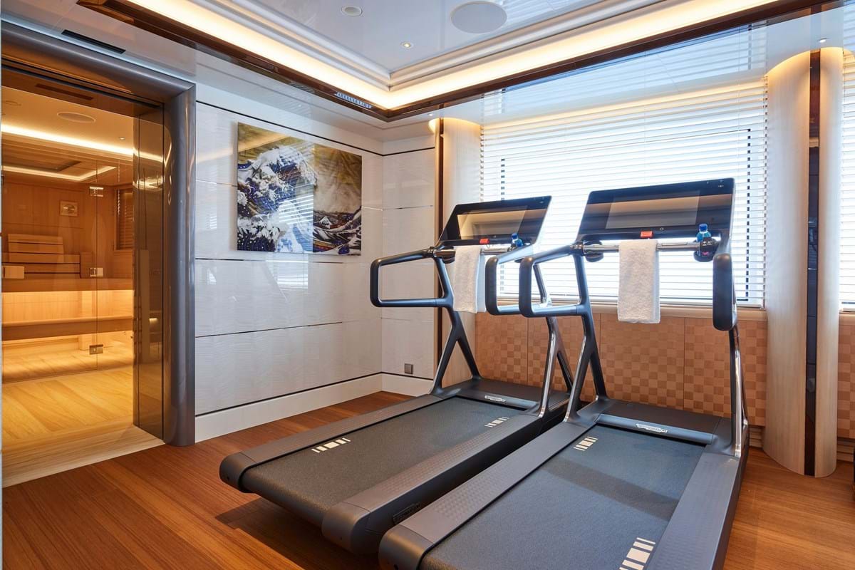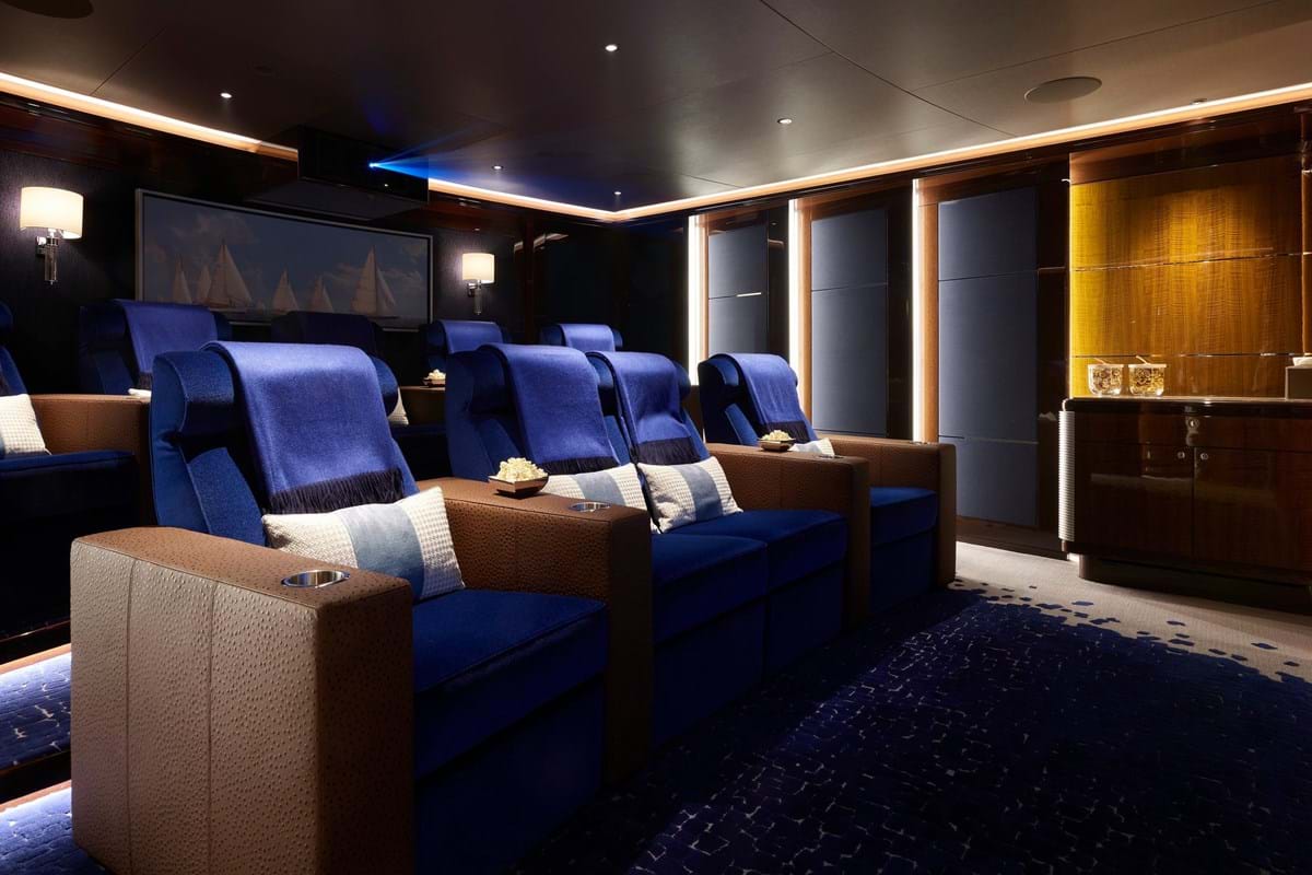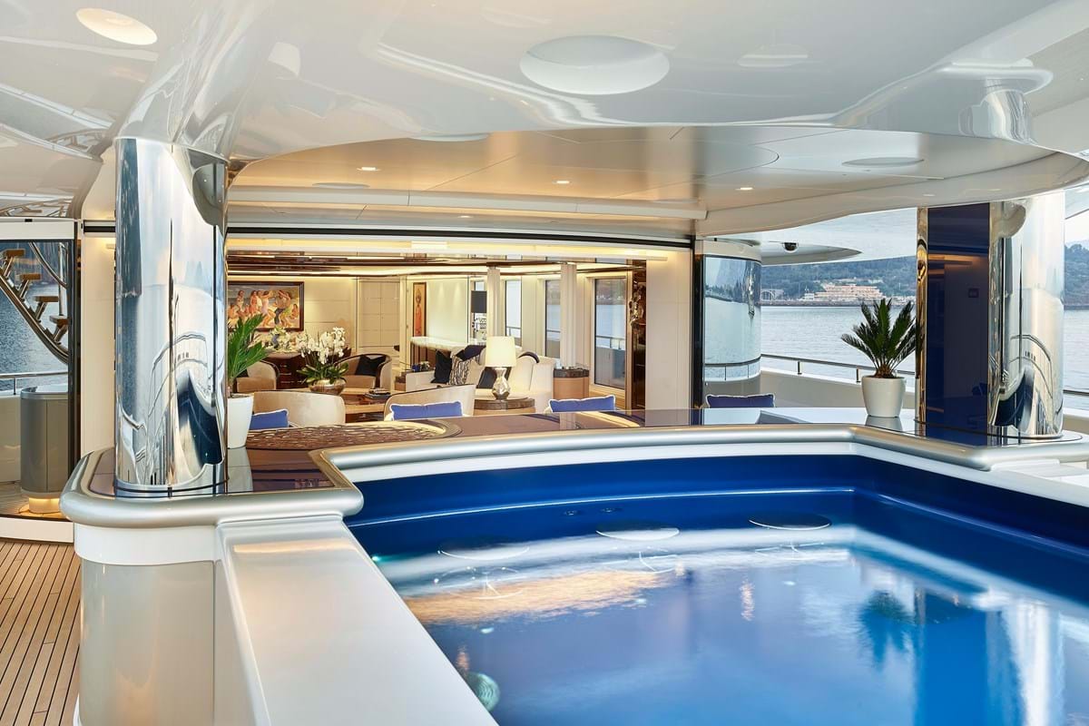 Other alluring features include a private owner’s deck with jacuzzi and sun lounging aft, terrace with seating forward and sensational views through angled full-height windows in the master suite and lounge. The sun deck is home to another jacuzzi and there is a large pool on the main deck aft with swim up bar. The main deck is also home to guest accommodation with six double cabins, each with its own colour scheme, a tiered cinema, spa with sauna and a gym.