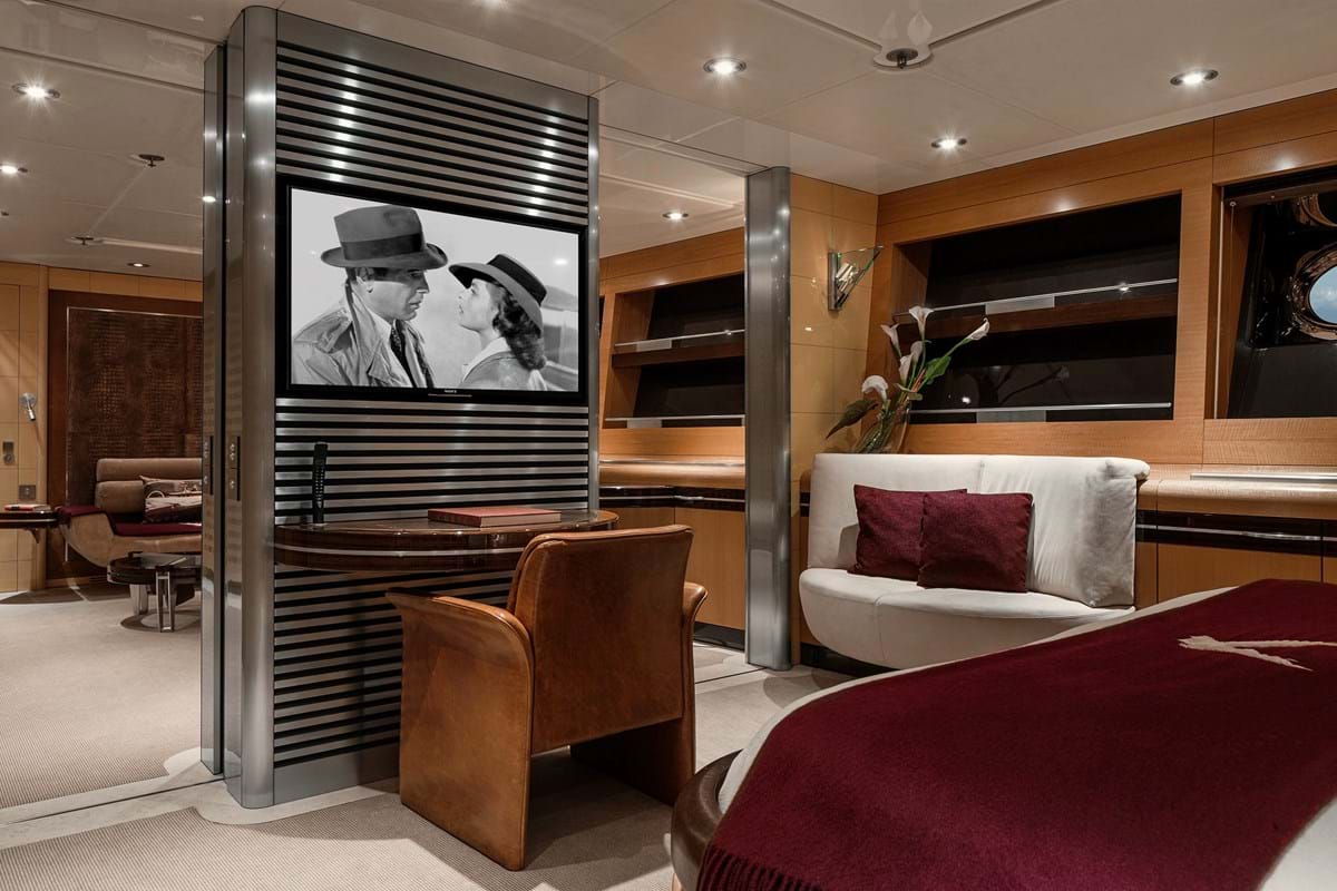 Communication & Entertainment: Outdoor cinema screen, B & O surround sound throughout the vessel, including lower and upper outside aft decks, satellite television channels, flat screen televisions in each cabin, iPod docking stations in all cabins, satellite & cellular communications facilities, VSAT, Fleet 77, Wi-Fi internet