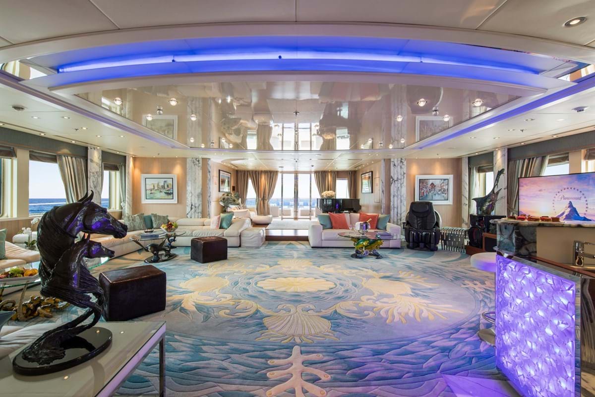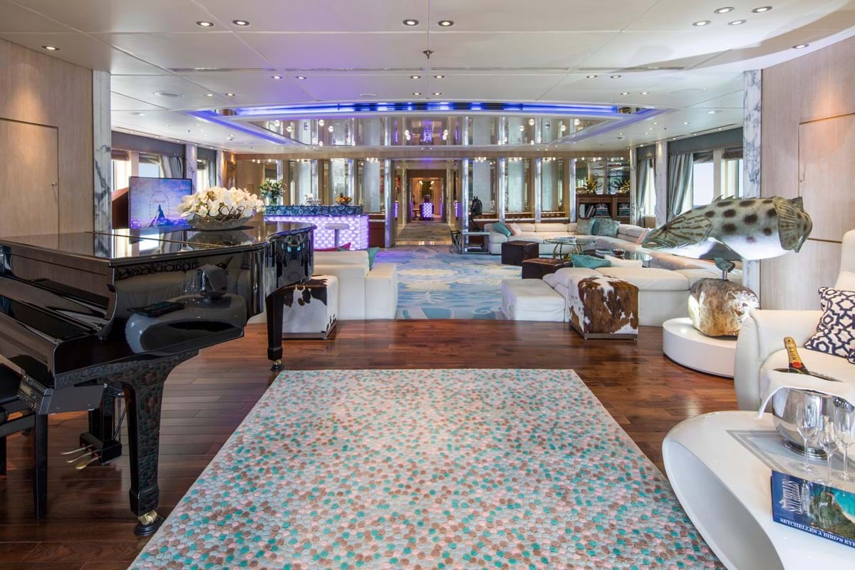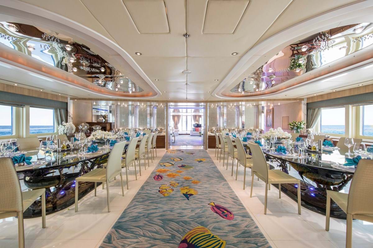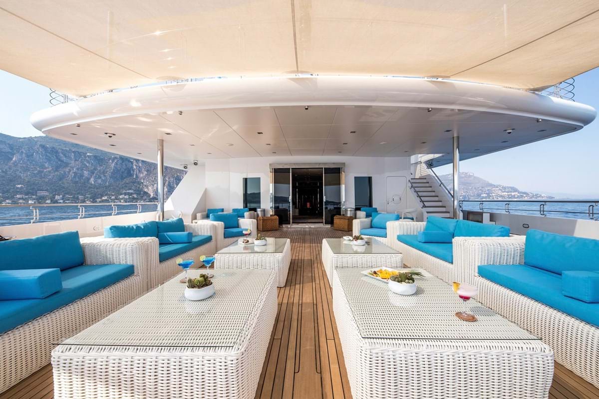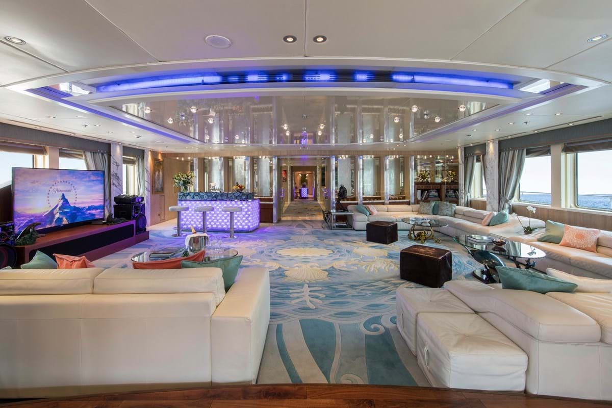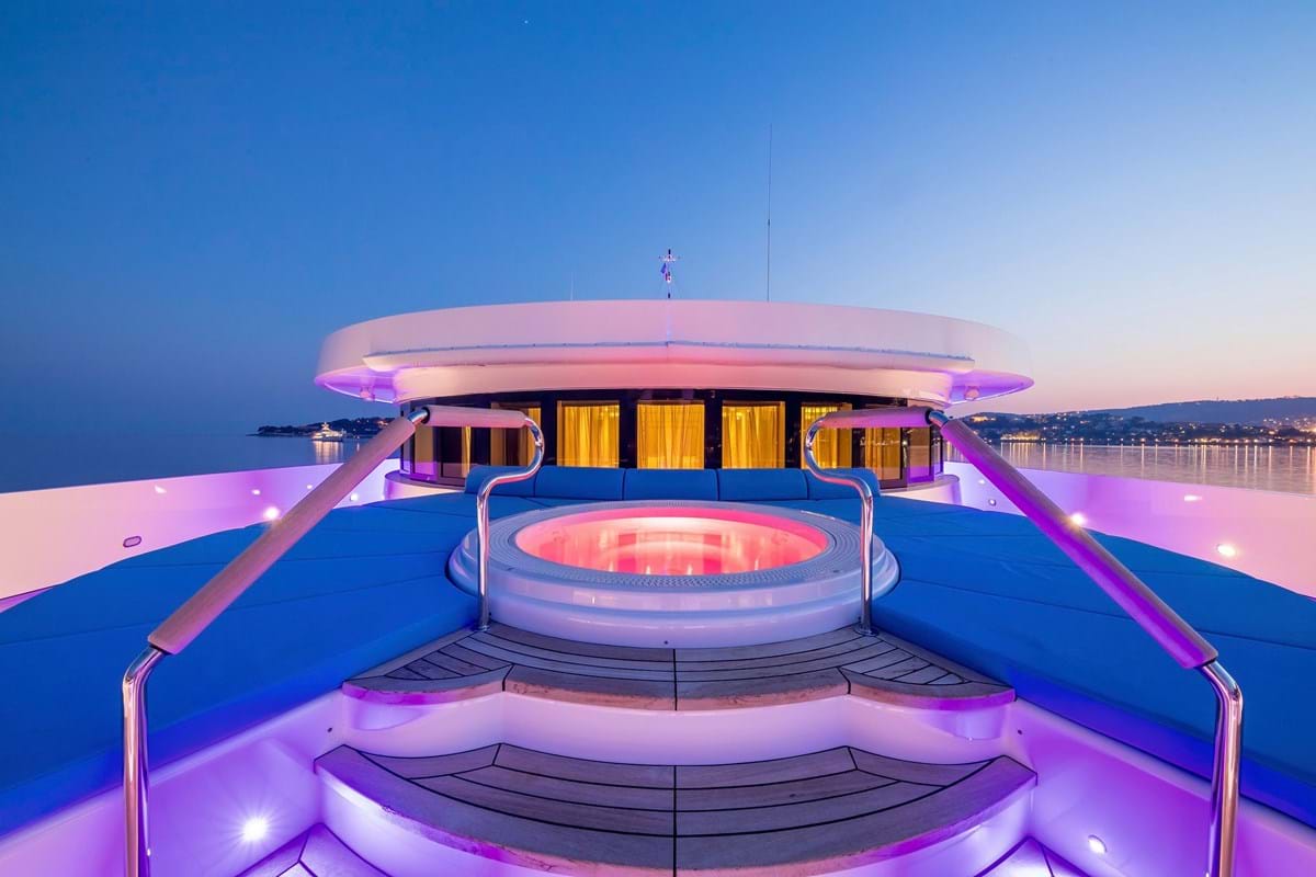 Her endless feature list includes an elevator serving all guest decks, a 3D cinema, a sun deck bar and jacuzzi, a private jacuzzi with sunbathing on the owner’s private deck, a beach club with bar and an intimate balcony for two as well as stabilisers that ensure comfort on board whether at sea or at anchor.